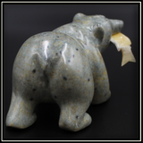 This Bear was carved from Soapstone by Eddie Lee. The fish is carved from Bison Horn. Dimensions: 5 3/4 x 3 1/2 x 3 1/4in